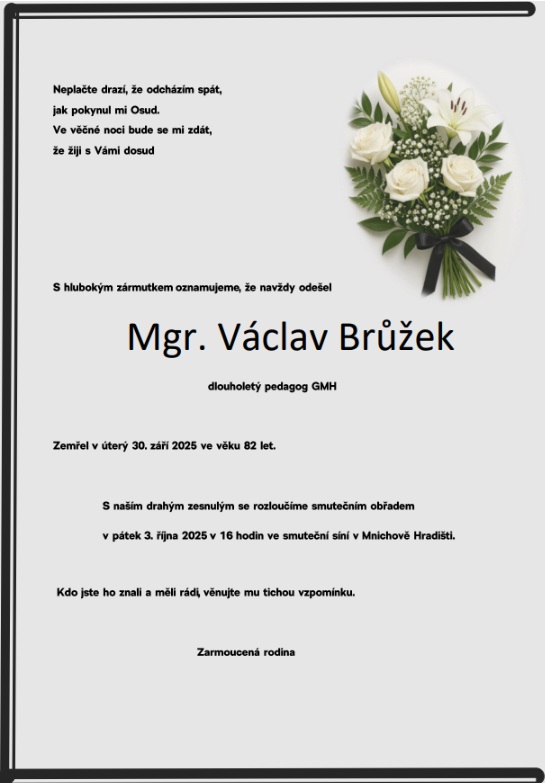 Se smutkem oznamujeme, že dne 30. 9. zemřel pan Mgr. Václav Brůžek, dlouholetý pedagog Gymnázia Mnichovo Hradiště. Jako nezapomenutelný učitel fyziky, laskavý třídní i moudrý kolega ovlivnil generace studentů i učitelů.
